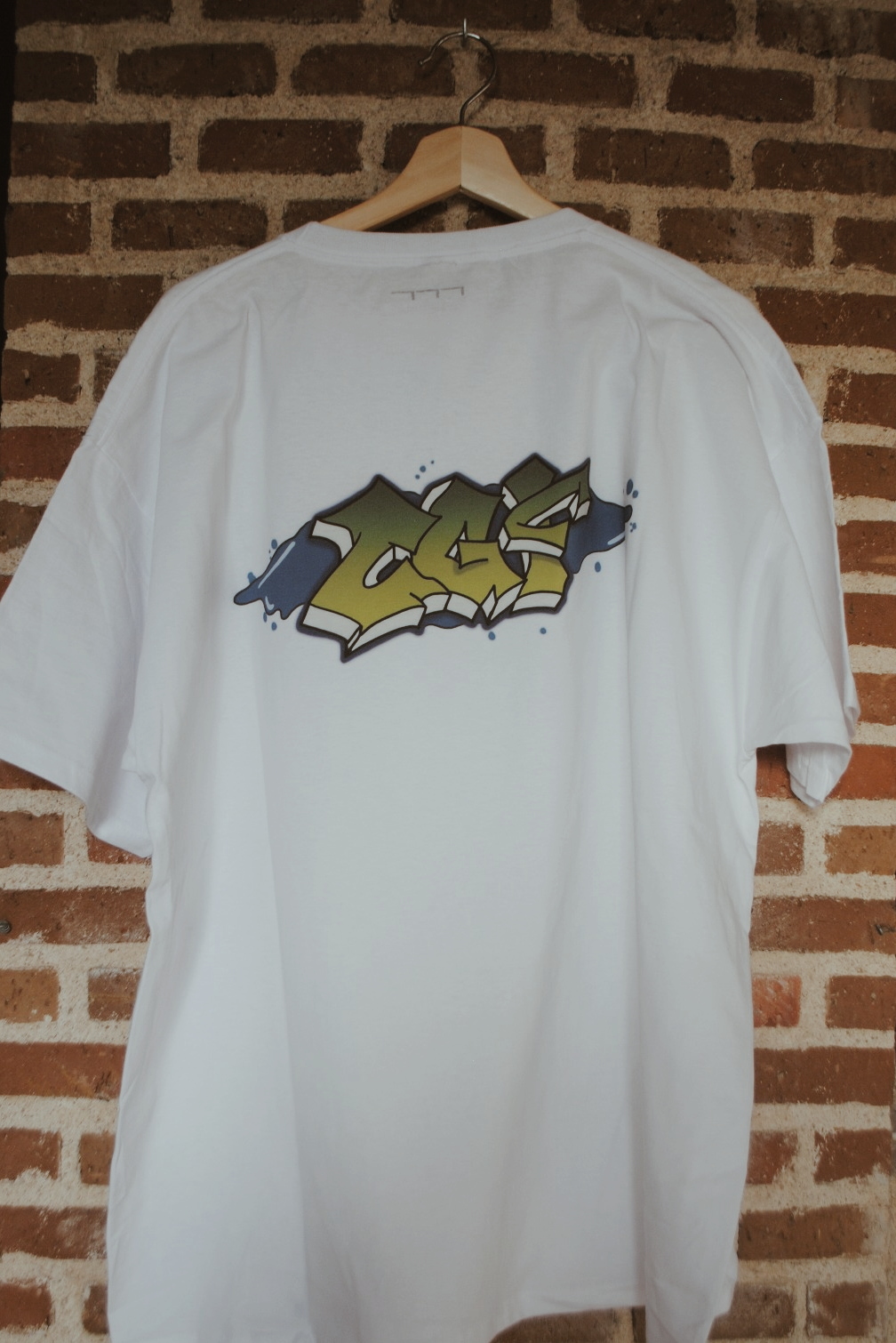 Camiseta blanca de manga corta con dibujo en la espalda.